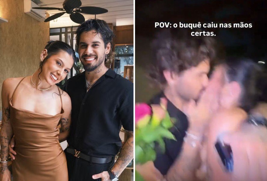Durante a tradicional disputa pelo buquê, Ana Castela foi a sortuda da noite e acabou ficando com as flores da noiva. A cena animou os convidados, que imediatamente começaram a gritar o nome de Zé Felipe, filho do cantor Leonardo. Em clima de descontração e carinho, o cantor respondeu aos gritos com um beijão na namorada, arrancando aplausos e registros dos convidados.