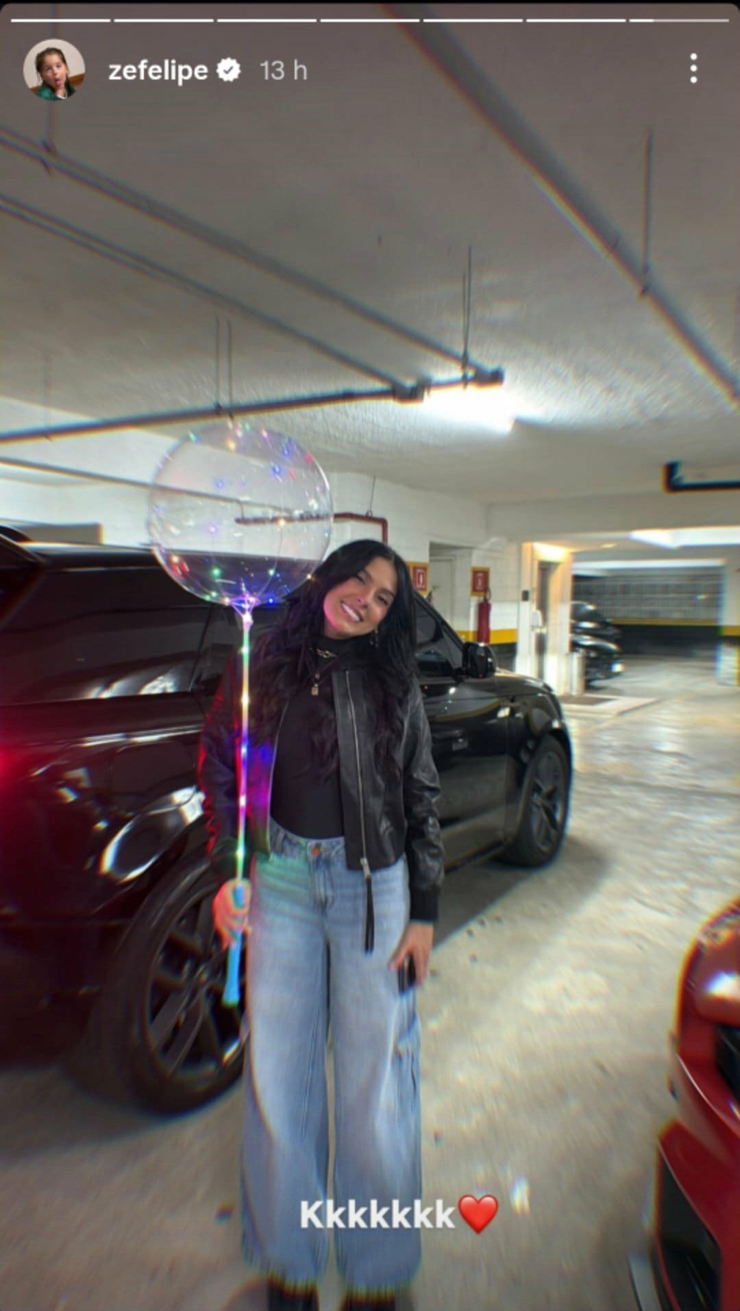 Em um estacionamento, a artista surgiu radiante, segurando um balão brilhante que ganhou do herdeiro de Leonardo. Sorridente e visivelmente apaixonada, Ana posou com o presente enquanto Zé Felipe registrava o momento.