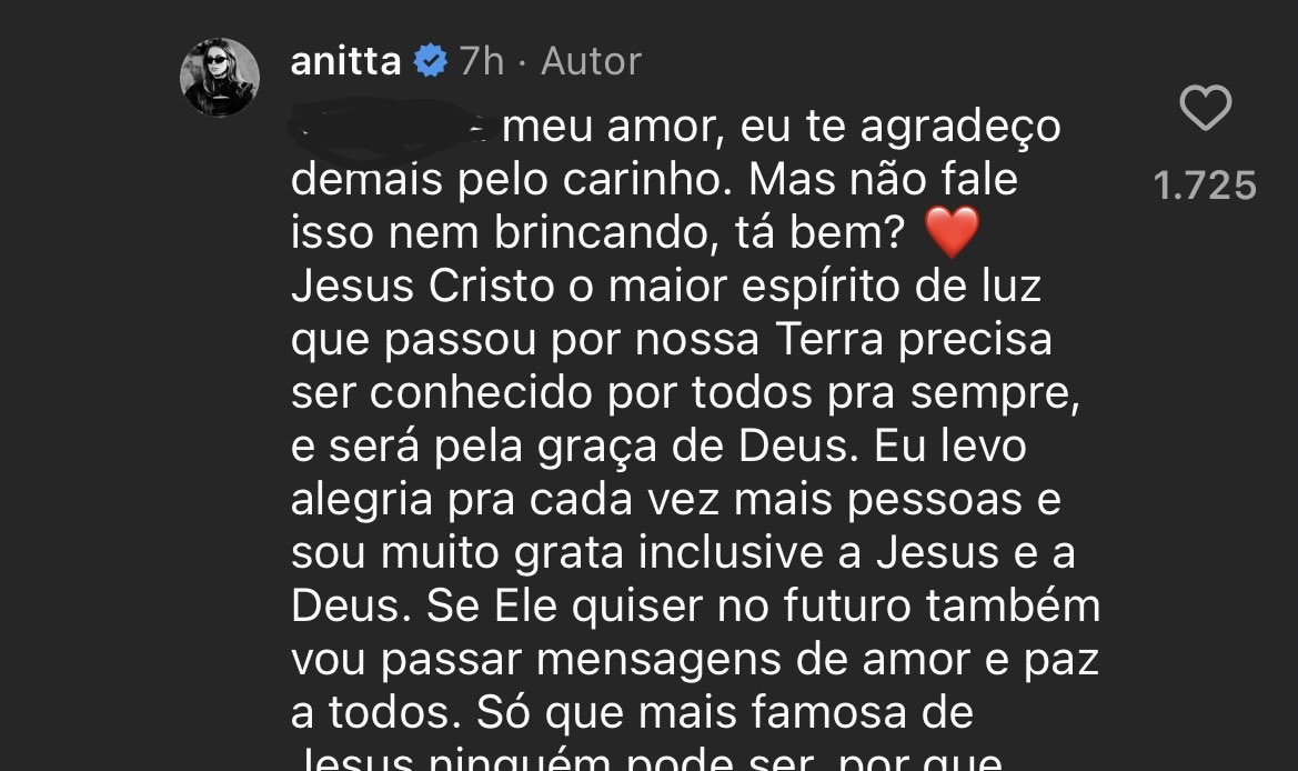 Em seguida, Anitta lembrou: “Se Ele quiser, no futuro, também vou passar mensagens de amor e paz a todos. Só que mais famosa de Jesus ninguém pode ser, por que seus ensinamentos precisam estar no coração de todos antes de qualquer outra coisa ou pessoa. Amo seu carinho, obrigada”.