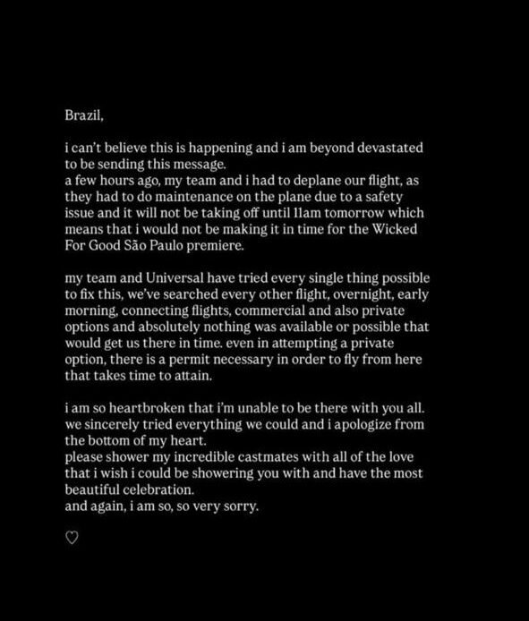 Em uma série de stories no Instagram, Ariana explicou que um problema técnico no avião impediu sua viagem ao Brasil. “Há algumas horas, minha equipe e eu tivemos que sair do avião, pois precisaram fazer manutenção devido a um problema de segurança — e ele não decolará até amanhã de manhã. Isso significa que não conseguirei chegar a tempo para a estreia de Wicked: Parte 2 em São Paulo”, escreveu a artista.