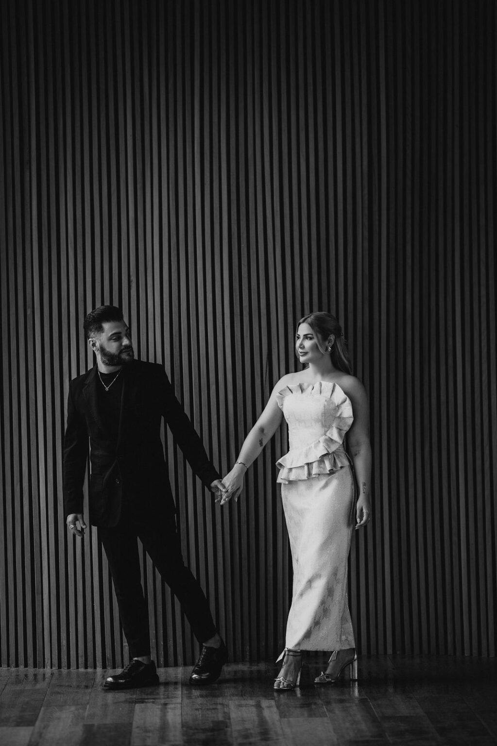 Antes do grande dia, o casal realizou um ensaio fotográfico pré-wedding. Nas imagens, Guilherme e Flaviana aparecem com looks elegantes, trocando beijos e gestos de carinho, além de exibirem as alianças de noivado para celebrar a nova fase da relação.