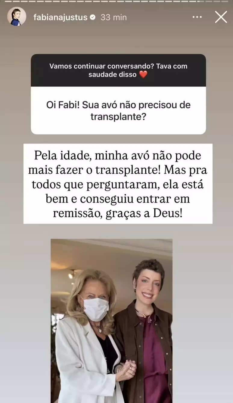 Em abril deste ano, a influenciadora digital Fabiana Justus revelou que sua avó, Celia Chryzman, recebeu o mesmo diagnóstico que ela, a leucemia mieloide aguda (LMA). Nesta quinta-feira (26), em interação com seguidores, ela foi questionada se a matriarca passou pelo transplante de medula óssea.