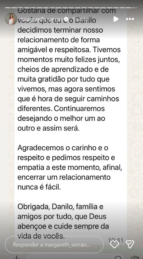 Por fim, Margareth pediu compreensão e respeito do público diante do momento delicado. “Agradecemos o carinho e pedimos respeito e empatia, afinal, encerrar um relacionamento nunca é fácil. Obrigada, Danilo, família e amigos, por tudo. Que Deus abençoe e cuide sempre da vida de vocês”, concluiu.