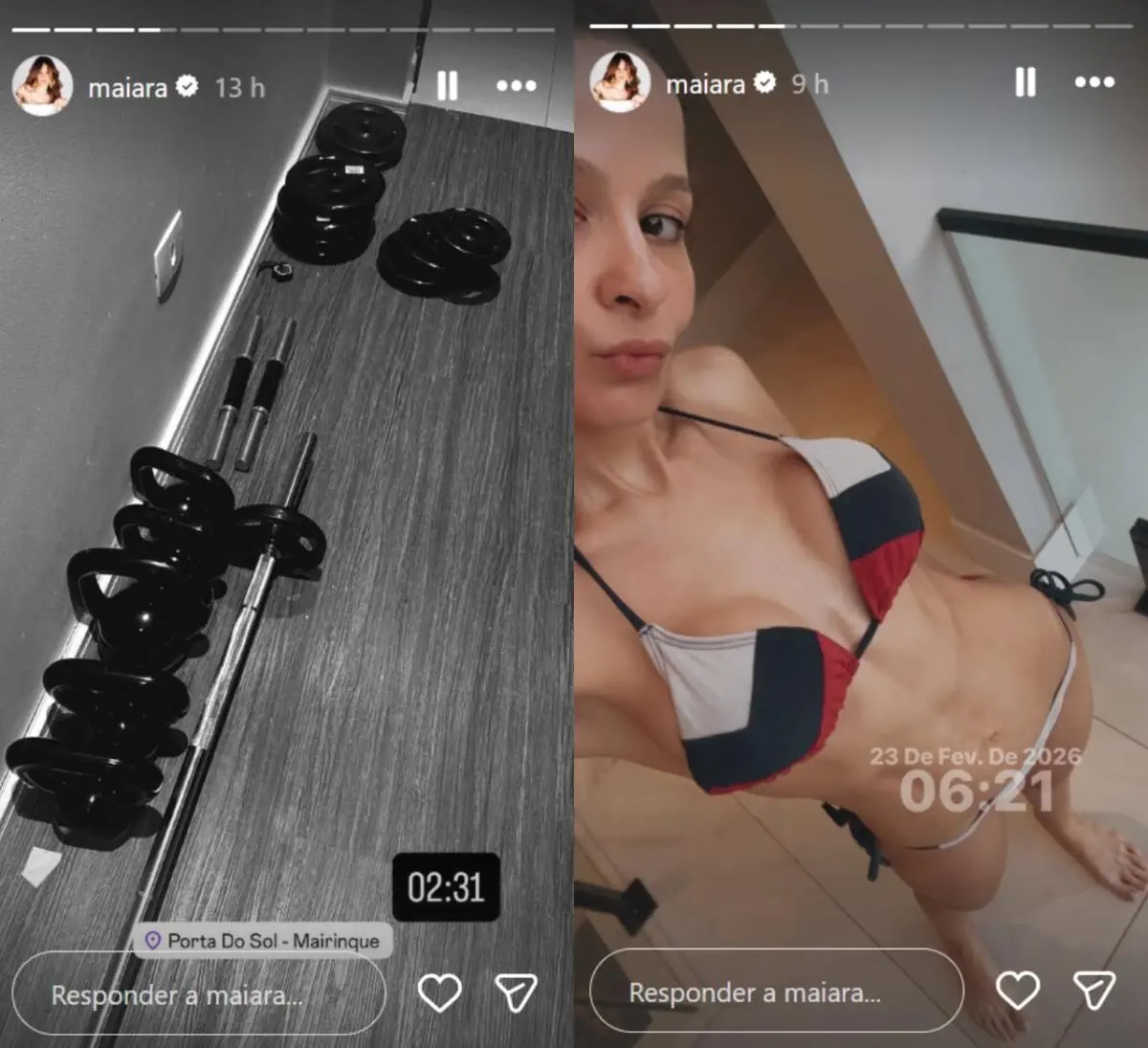 Nos stories, Maiara mostrou aparelhos de musculação, pesos espalhados e marcou a localização em Mairinque (SP). O detalhe que mais chamou atenção foi o horário exibido na tela do celular: 2h31.