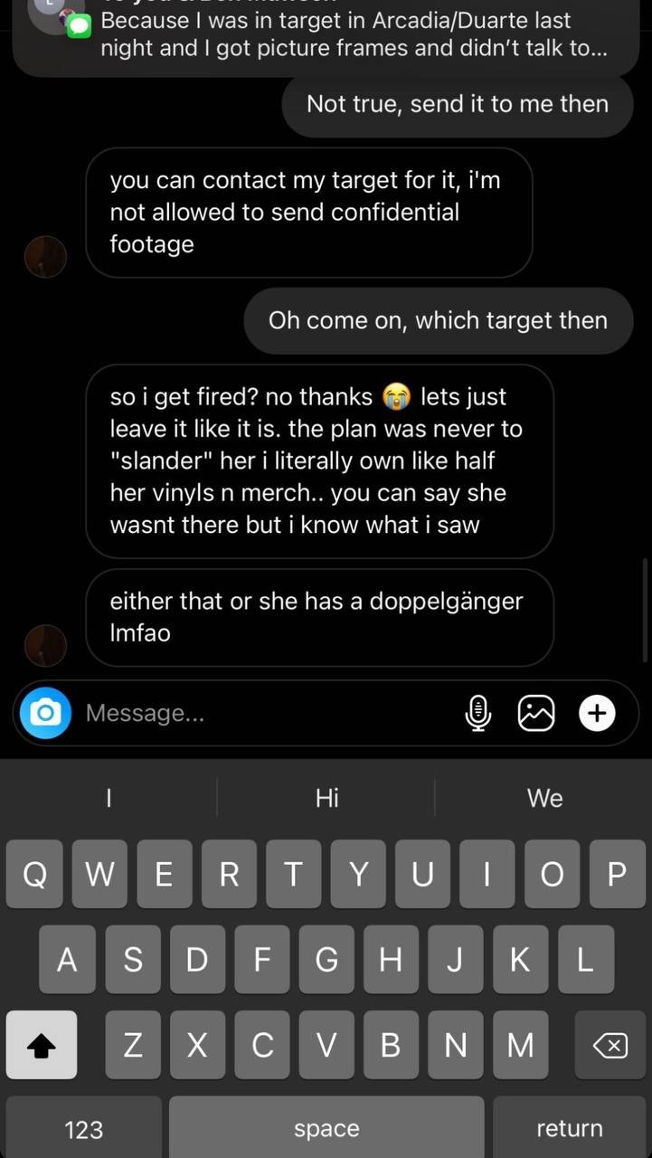 Pessoa: Para eu ser demitido? Não, obrigado. Vamos deixar as coisas como estão. O plano nunca foi prejudicar ela com mentiras, eu literalmente tenho metade dos vinis e produtos oficiais dela. Foi isso ou ela tem um doppelgänger [ser que tem a capacidade de se transformar em alguém].