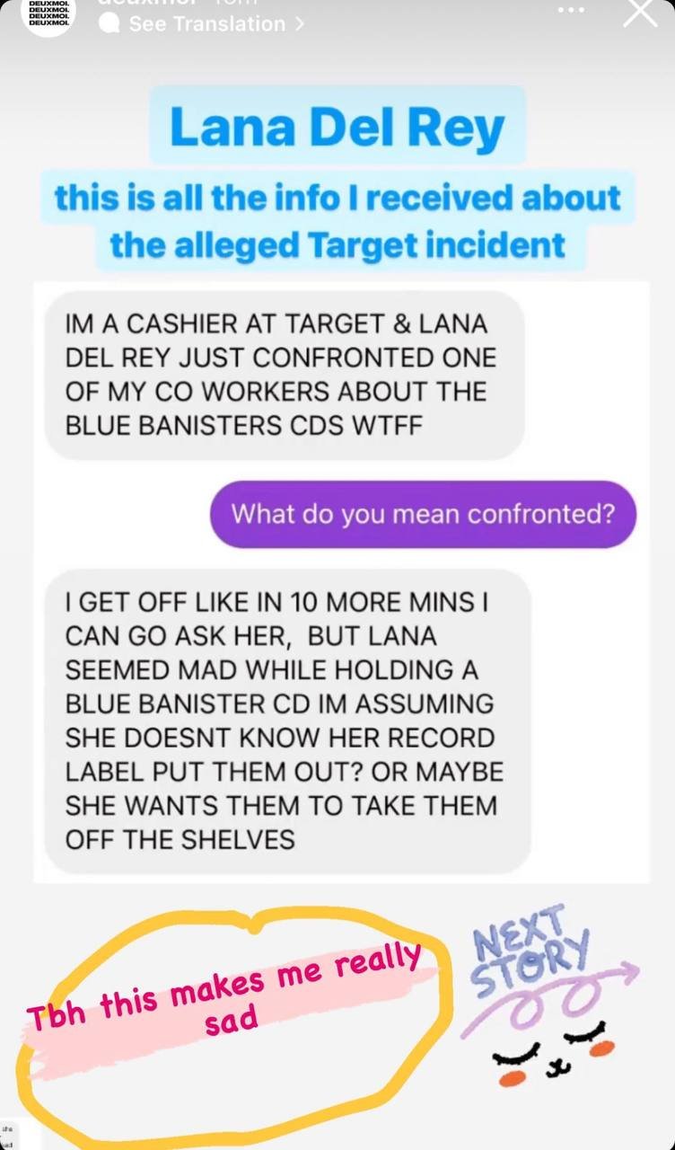 Por mais que aparente ser uma pessoa sempre calma e pacífica, Lana Del Rey provou que esse não é o mood que ela se encontra após ser acusada de brigar com atendentes da Target, uma loja onde são vendidos diversos tipos de produtos, por seu novo álbum, “Blue Banisters”, supostamente estar sendo vendido na loja antes do lançamento oficial.