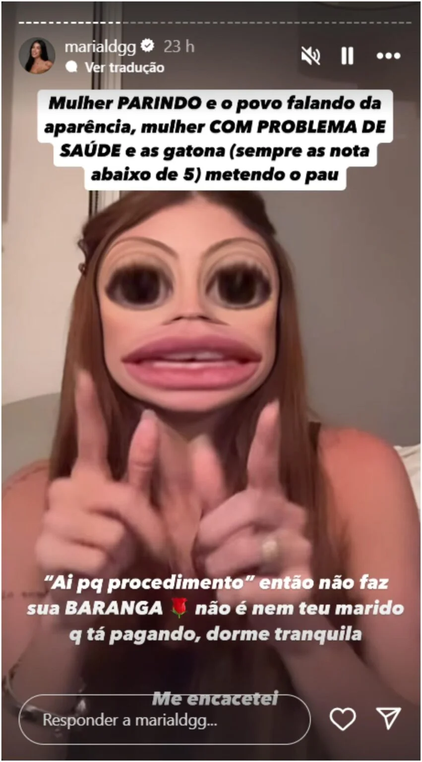 “Vai chegar uma hora que as influenciadoras vão coringar. Vai todo mundo começar a expor a cara das gatonas. ‘Tá feia, tá baranga. Todo mundo tem que achar todo mundo bonito?’. Não, mas guarda para você. Falou do corpo, da cara, tem mulher que tá parindo e o povo criticando a aparência. Fulano passando por problema de saúde e a galera criticando a aparência. Só as gatas. Só nota 5 abaixo, nunca 5 acima. Sempre as feias, com todo respeito, sempre as barangas”, declarou ela.