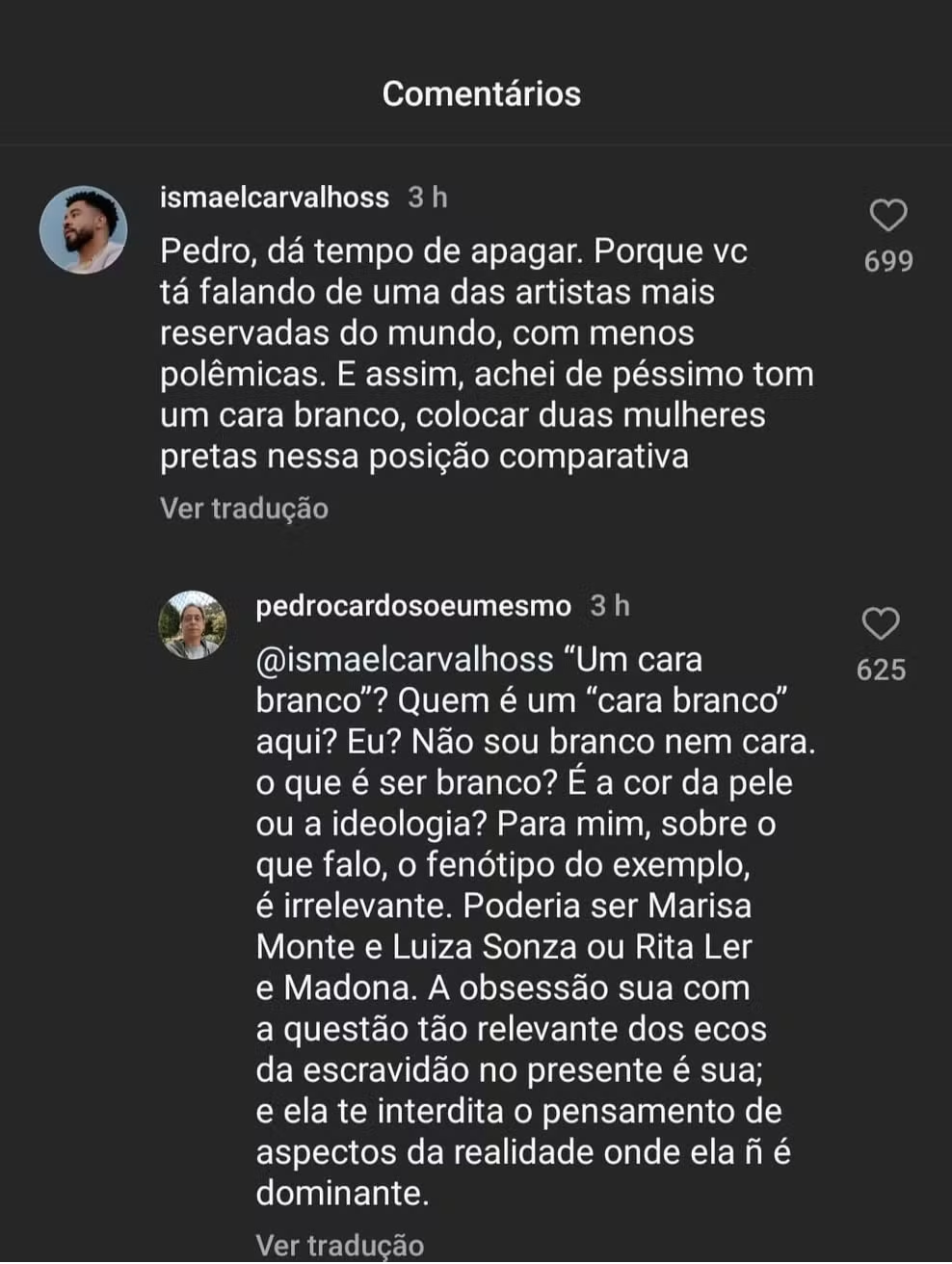 O influenciador e comunicador Ismael Carvalho rebateu ao post na legenda, reforçando que a americana, que veio recentemente ao Brasil, em Salvador, é uma das artistas mais reservadas que existe. Além disso, também pontuou que era problemático um cara branco colocar duas mulheres negras em posições comparativas. Em resposta, Pedro Cardoso afirmou não ser branco: “Um cara branco? Quem é um ‘cara branco’ aqui? Não sou branco nem cara. O que é ser branco? É a cor da pele ou a ideologia? Para mim, sobre o que falo, o fenótipo do exemplo, é irrelevante. Poderia ser Marisa Monte e Luísa Sonza ou Rita Lee e Madonna”, afirmou.