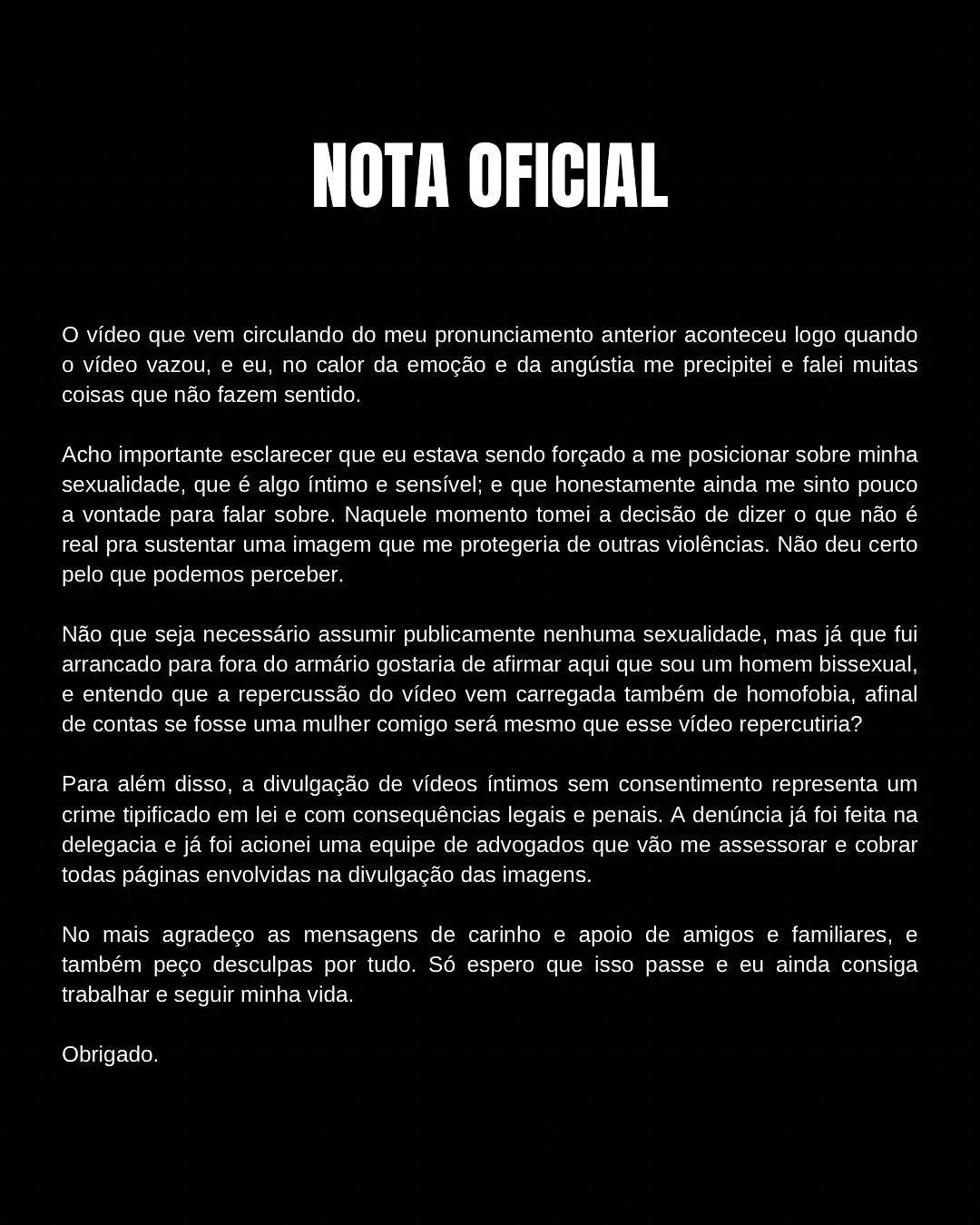 ‘’Não que seja necessário assumir publicamente nenhuma sexualidade, mas já que fui arrancado para fora do armário gostaria de afirmar que sou um homem bissexual, e entendo que a repercussão do vídeo vem carregada também de homofobia, afinal de contas se fosse uma mulher comigo será mesmo que esse vídeo repercutiria? ’’, completou.