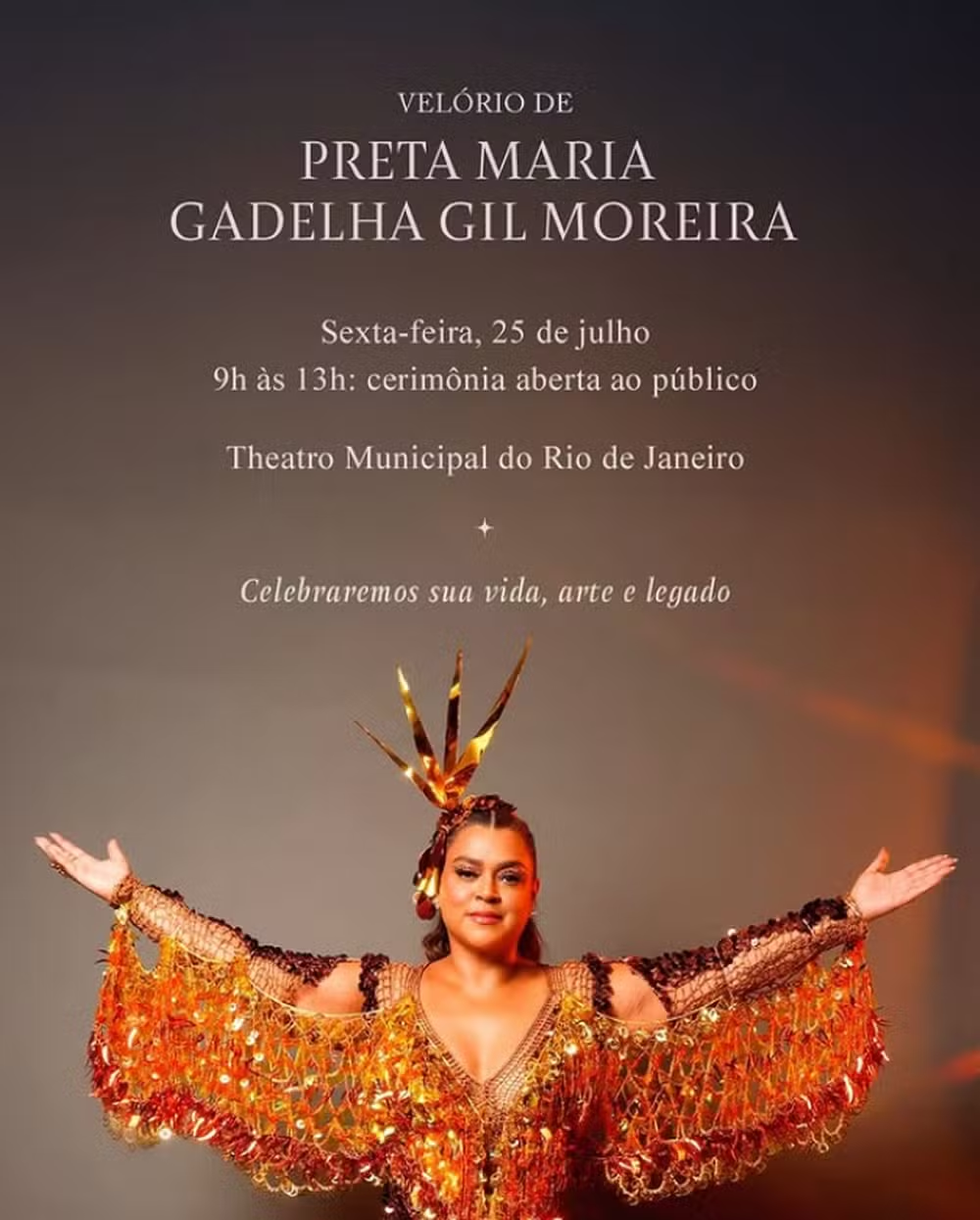 “Velório de Preta Maria Gadelha Gil Moreira, sexta-feira, 25 de julho, das 9h às 13h: cerimônia aberta ao público no Theatro Municipal do Rio de Janeiro. Celebraremos sua vida, arte e legado”, dizia o texto na imagem de divulgação da cerimônia.