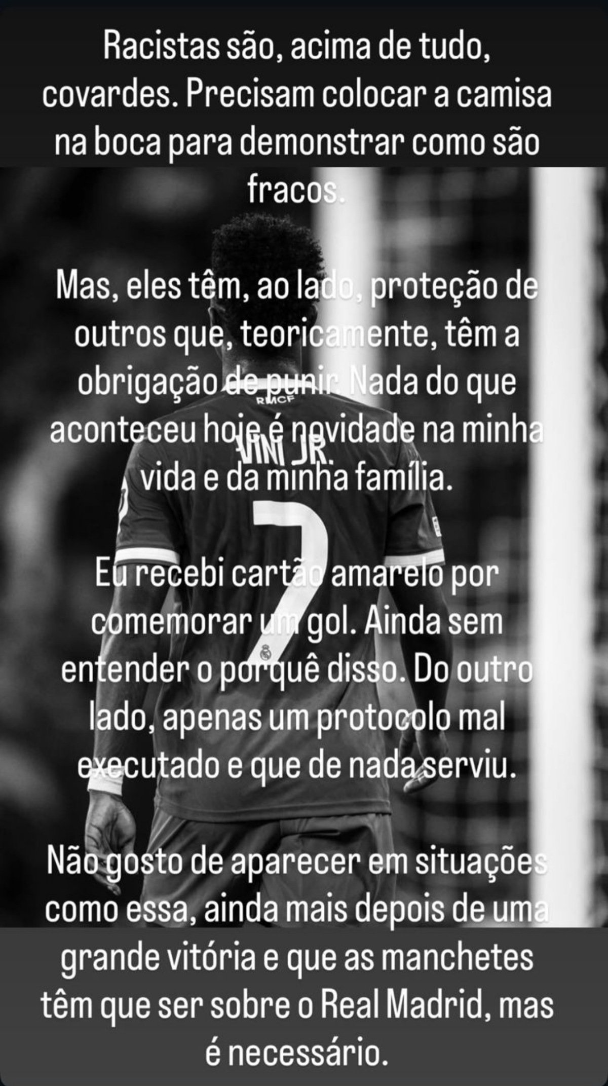 Em sua conta oficial no Instagram, Vini Jr. lamentou mais um episódio de racismo na carreira e afirmou que a situação “não é novidade”. O atacante ainda classificou os responsáveis como “covardes” e criticou a forma como o protocolo foi executado.